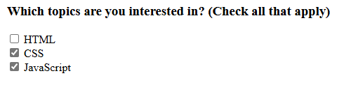Explanation: If a user leaves "CSS" and "JavaScript" checked and submits, the browser might send the data as interests=css&interests=javascript. The server-side code will know to collect all values associated with the interests name.